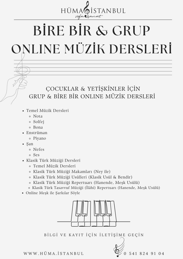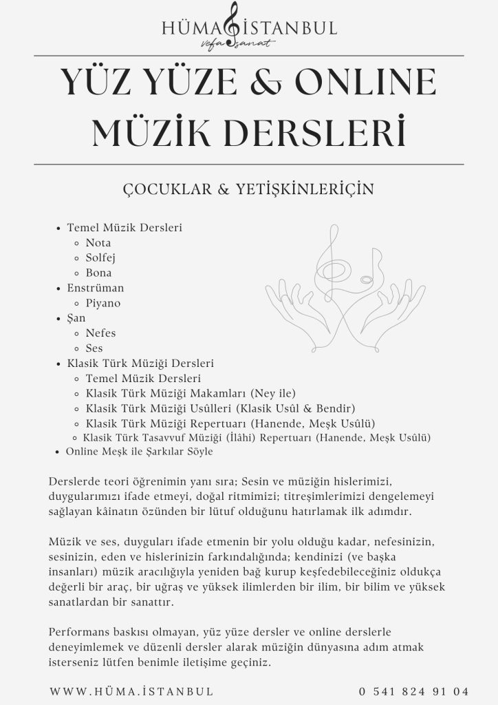 Performans baskısı olmayan, yüz yüze dersler ve online derslerle deneyimlemek ve düzenli dersler alarak müziğin dünyasına adım atmak isterseniz lütfen benimle iletişime geçiniz.